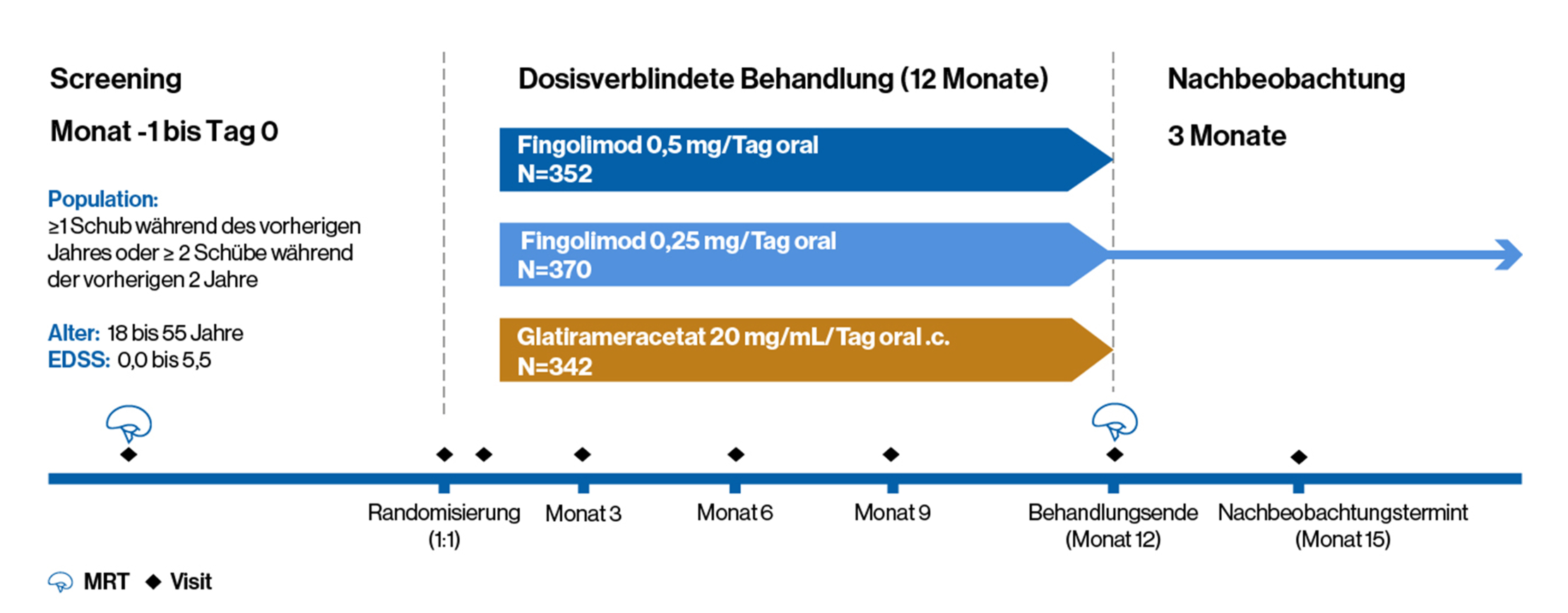 Eine einjährige, randomisierte, dosis- und Prüfarzt-verblindete, aktiv-kontrollierte (Glatirameracetat-Injektion) SQ-Studie der Phase 3b bei Erwachsenen mit RRMS. Patienten, die nach dem Zufallsprinzip einer einmal täglichen Behandlung mit Fingolimod 0,25 mg und 0,5 mg gegenüber einer einmal täglichen subkutanen Injektion von Glatirameracetat 20 mg zugeteilt wurden. Zu Beginn der Studie hatten Patienten mit RRMS im Alter zwischen 18 und 65 Jahren (Median 39) ≥ 1 dokumentierten Schub während des letzten Jahres oder ≥ 2 dokumentierte Schübe während der letzten 2 Jahre und wiesen einen EDSS-Score von 0,0 bis 6,0 auf (Medianwert zu Baseline 2,5). Der primäre Endpunkt war das ARR.